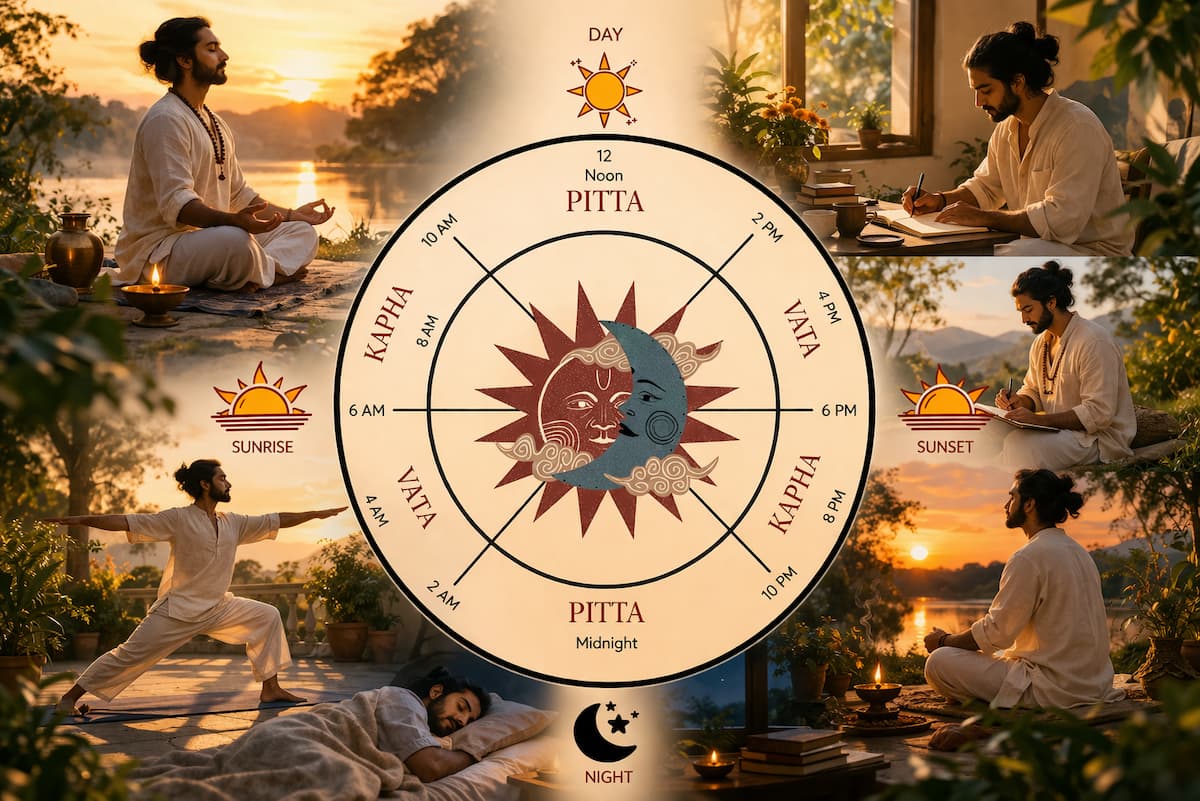 Each day flows through cycles of the three doshas—Vata, Pitta, and Kapha—repeating twice in 24 hours.
